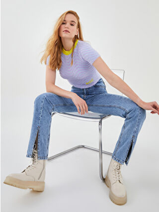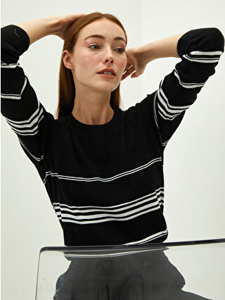 Bisiklet Yaka Çizgili Uzun Kollu Pamuklu Kadın Kazak