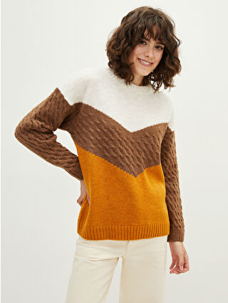Bisiklet Yaka Renk Bloklu Uzun Kollu Kadın Triko Kazak