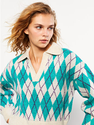 Polo Yaka Desenli Uzun Kollu Kadın Triko Kazak